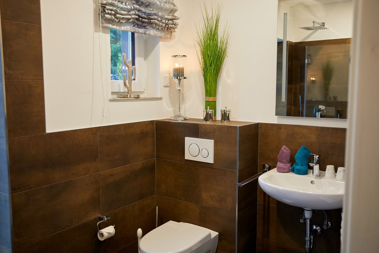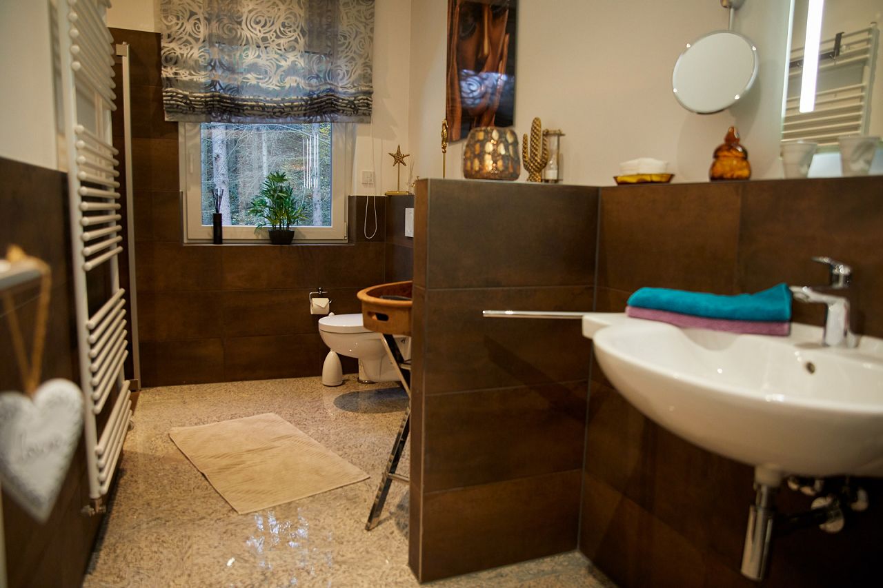 In 3 Schlafzimmern ( 2 x Boxspringbetten, 1 x Etagenbett ) finden Sie die wohlverdiente Ruhe. Selbstverständlich sind die Schlafzimmer mit Fernseher ausgestattet. Im Haus befinden sich 2 Bäder in denen Sie barrierefrei duschen können.