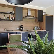 Alle Mahlzeiten können in der urigen Küche oder im gegenüberliegenden Esszimmer genossen werden. Das Esszimmer mit Kaminofen lädt förmlich zum Digestif am Feuer ein.